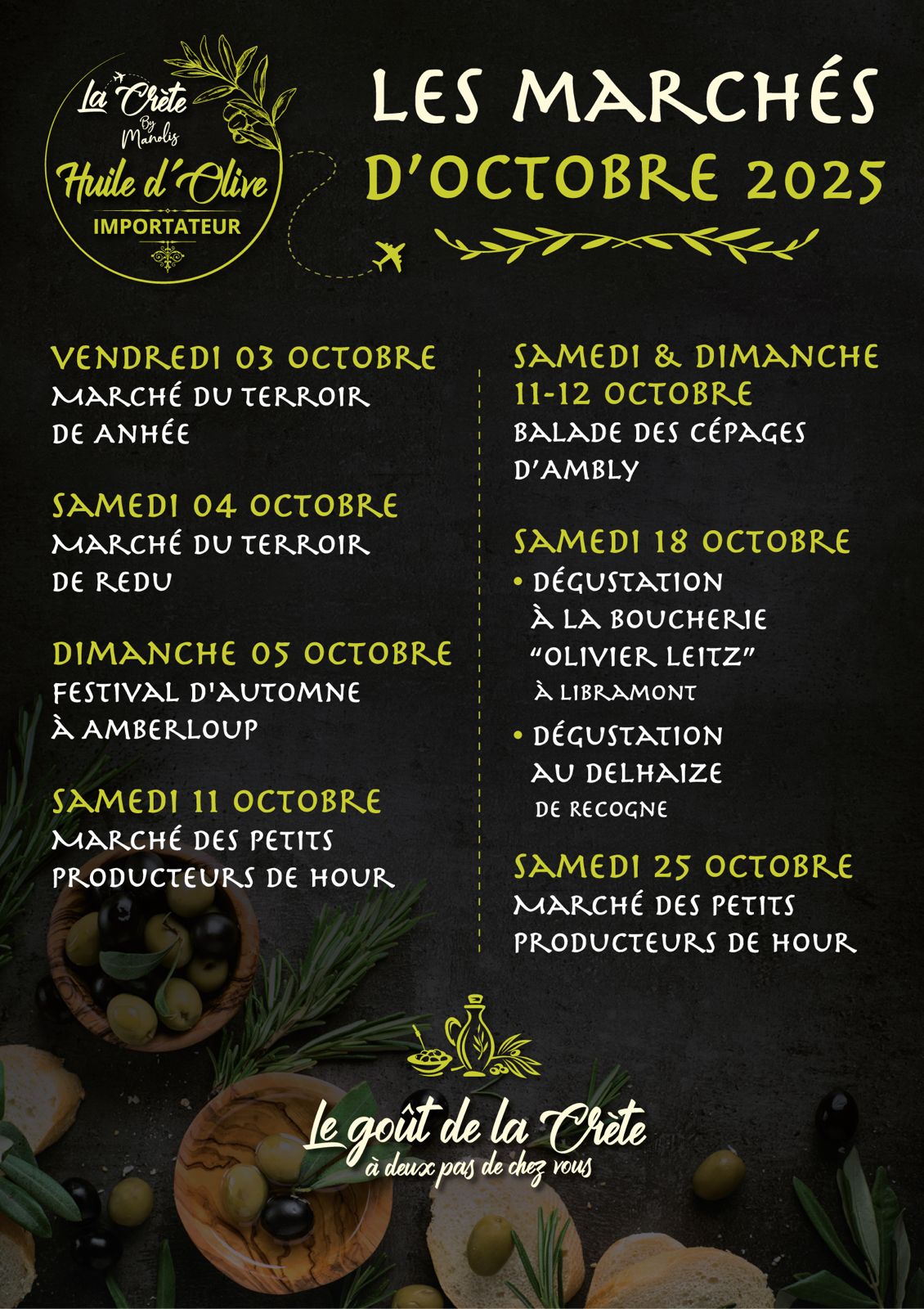 Pour être au plus près de vous, nous participons régulièrement à des marchés et foires. Ces événements sont l’occasion parfaite pour venir à notre rencontre, découvrir nos produits, et échanger avec nous sur notre passion pour la Crète et ses trésors culinaires.
